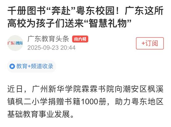 2025年7-9月,《中国新闻网》《南方日报》《羊城晚报》等媒体报道了学校与南澳县教育局联合主办的“杏坛笃行”学术沙龙,聚焦“数智赋能海岛教育”的创新模式探索,与南澳中学共建“药植园”劳动教育基地及博士工作站;霖霖书院于东莞校区举行书香新华·诗韵枫溪“006计划”公益活动公益捐书1000册,以实际行动为粤东基础教育注入文化动力,体现了学校的社会责任与担当,也为推动教育均衡发展贡献了“新华力量”。