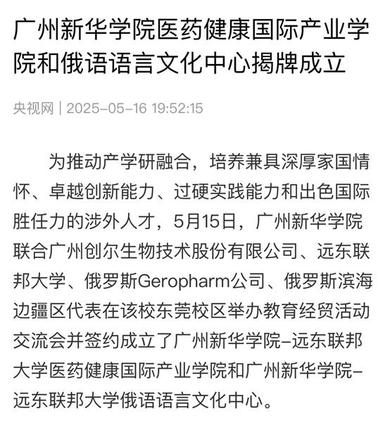 2025年5月,《央视网》《中国新闻网》《中国教育在线》《羊城晚报》《广州日报》《东莞日报》《金羊网》等媒体报道了学校与远东联邦大学的合作动态。2025年是中俄建交76周年,为响应深化教育合作号召,学校与远东联邦大学举办教育经贸活动交流会,签约成立医药健康国际产业学院和俄语语言文化中心。这一合作不仅为师生拓展了发展空间,更为两国教育与事业发展注入了新活力,标志着学校国际化办学迈出了坚实步伐。