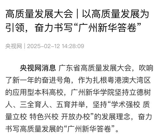 2025年3月,《央视网》《羊城晚报》等媒体报道学校作为扎根大湾区的民办应用型本科高校,积极响应广东全省教育大会精神,持续深化产教融合,推动教育、人才、产业与创新链条有效衔接,为大湾区经济社会发展注入源源不断的“新华力量”。