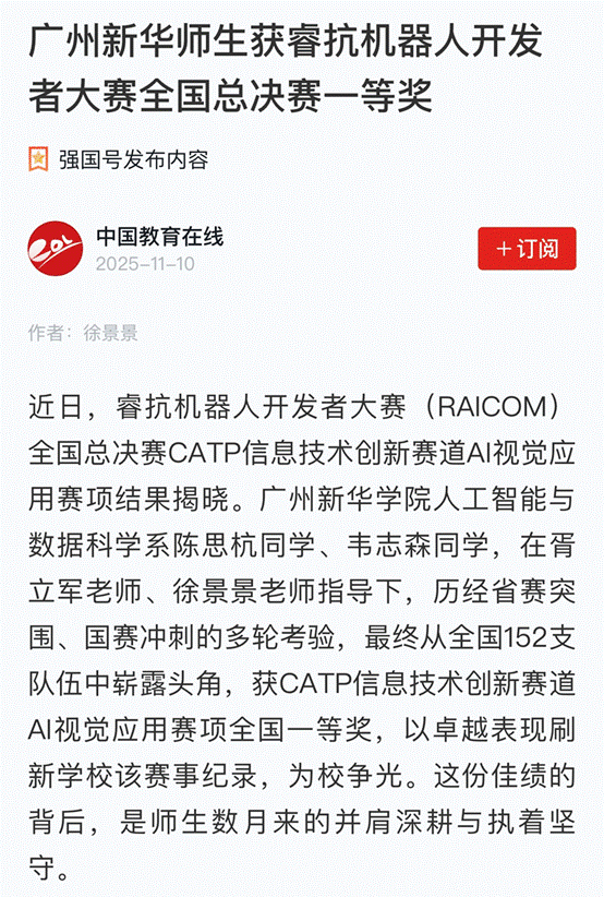 2025年11月,《中国教育在线》《中国高校之窗》《广州日报》等媒体报道了学校在睿抗机器人开发者大赛中的优异成绩。学校人工智能与数据科学系的陈思杭、韦志森同学,在胥立军、徐景景老师的指导下,历经省赛、国赛多轮考验,从全国152支队伍中脱颖而出,斩获全国一等奖,刷新了学校在该赛事的纪录,彰显了学校师生的专业实力与拼搏精神。