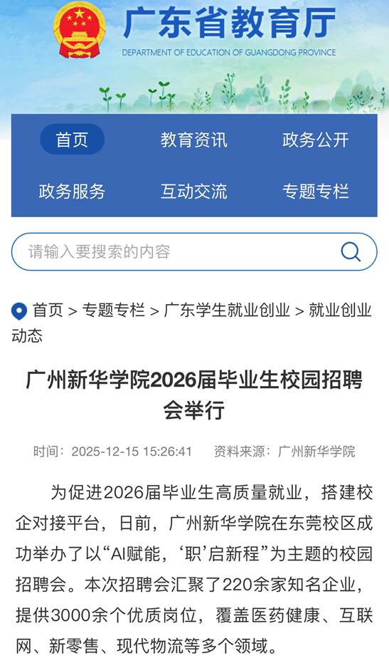 2025年12月,广东省教育厅及《中央广电总台国际在线》《中国教育在线》《中国高校之窗》《广州日报》《东莞日报》等媒体报道学校2026届毕业生校园招聘会。学校在东莞校区成功举办以“AI赋能,‘职’启新程”为主题的招聘会,汇聚220余家知名企业,提供3000余个优质岗位。这一活动不仅为学生拓展了就业渠道,更展现了学校与社会企业紧密合作、共同推动人才培养与就业的良好局面。