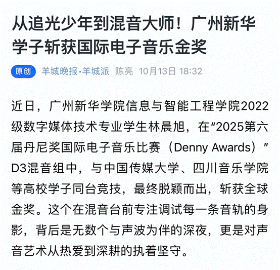 2025年10月,《羊城晚报》《广州日报》《东莞日报》等媒体报道了学校信息与智能工程学院2022级学生林晨旭,在“2025第六届丹尼奖国际电子音乐比赛”中斩获全球金奖,展现了其对声音艺术的深厚热爱与执着追求。