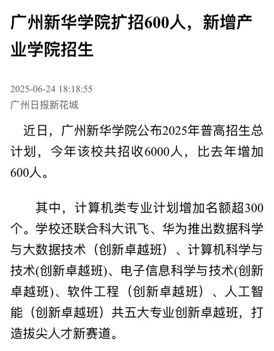2025年6月,《羊城晚报》《新快报》《广州日报》等媒体报道了学校面对社会发展的新需求,积极调整招生策略,2025年普高总计划招收6000人,较去年增加600人,其中计算机类专业计划增幅超300%。同时,学校还联合科大讯飞、华为推出数据科学与大数据技术等5大专业创新卓越班,旨在打造拔尖人才培养的新赛道,为更多学子提供优质教育机会。