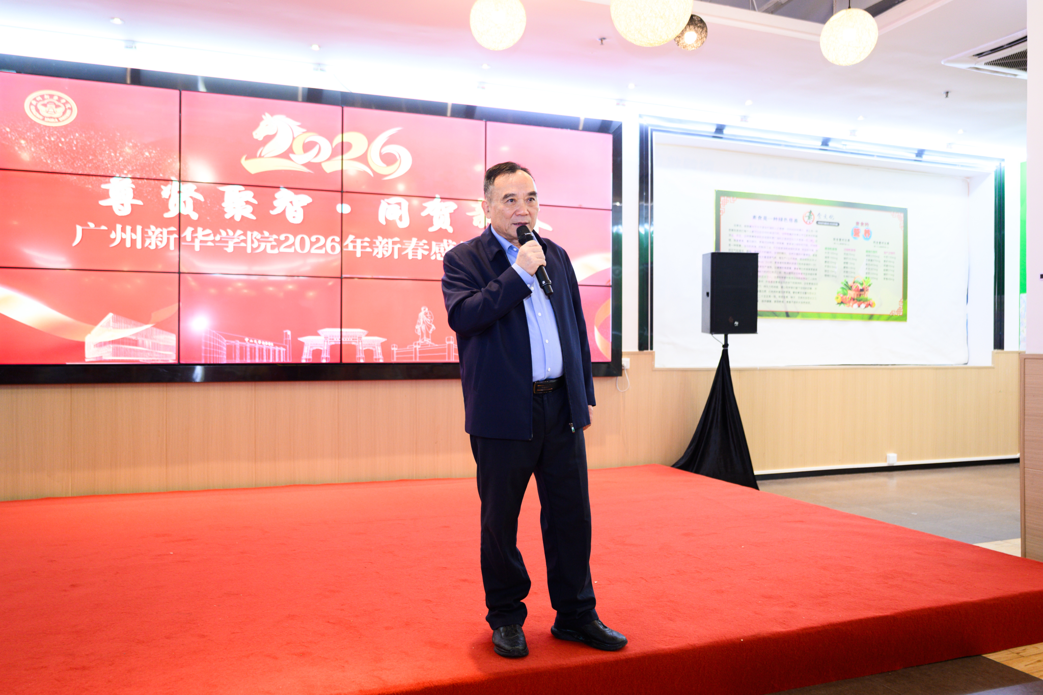会后,学校董事会设“尊贤聚智 同贺新春”——广州新华学院2026年新春感恩茶话会,刘荣海董事长发表讲话。他代表董事会向辛勤劳动的全体教职员工表示感谢。