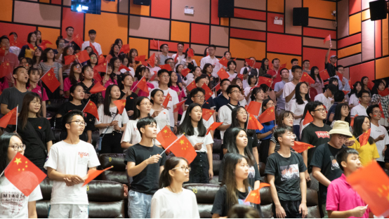 观影过程中,全场师生沉浸于历史长河中,找寻内心深处与祖国的情感共鸣。影片尾声,伴随着旋律响起,大家自发起立,挥舞着手中的五星红旗,和着片尾曲一同唱起了《我和我的祖国》,歌声久久回荡在影厅上空……