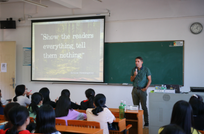 当日下午,中外作家还带来了四场平行讲座,内容涵盖写作技巧、文学创作、文化传播、作品鉴赏等内容。平行讲座是写作营历来的“传统”,每年的讲座都经过精心设计,不仅契合当代大学生“口味”,更是紧扣时代主题,走在文学创作前沿。作家Finley McDonald带来“Fiction-Writing Modes: how to ‘tell’ Successfully”、熊育群主讲《创作•人性•救赎》、范若恩主讲《情何以生?-- 中国文化对外传播杂感》、谢桂霞主讲《“骚”客莎翁 -- 莎士比亚戏剧语言鉴赏》。作家们独到的观点,丰富的文学创作技巧为我校师生带来一场文学盛宴。