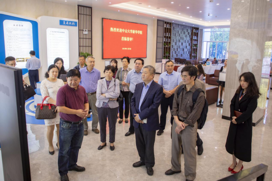 中山大学新华学院代表团一行在广东省科学院党委书记、院长廖兵和党委委员、副院长李定强同志的带领下在展厅参观