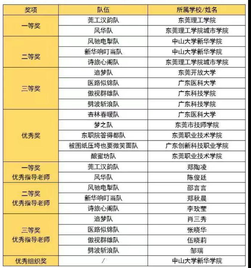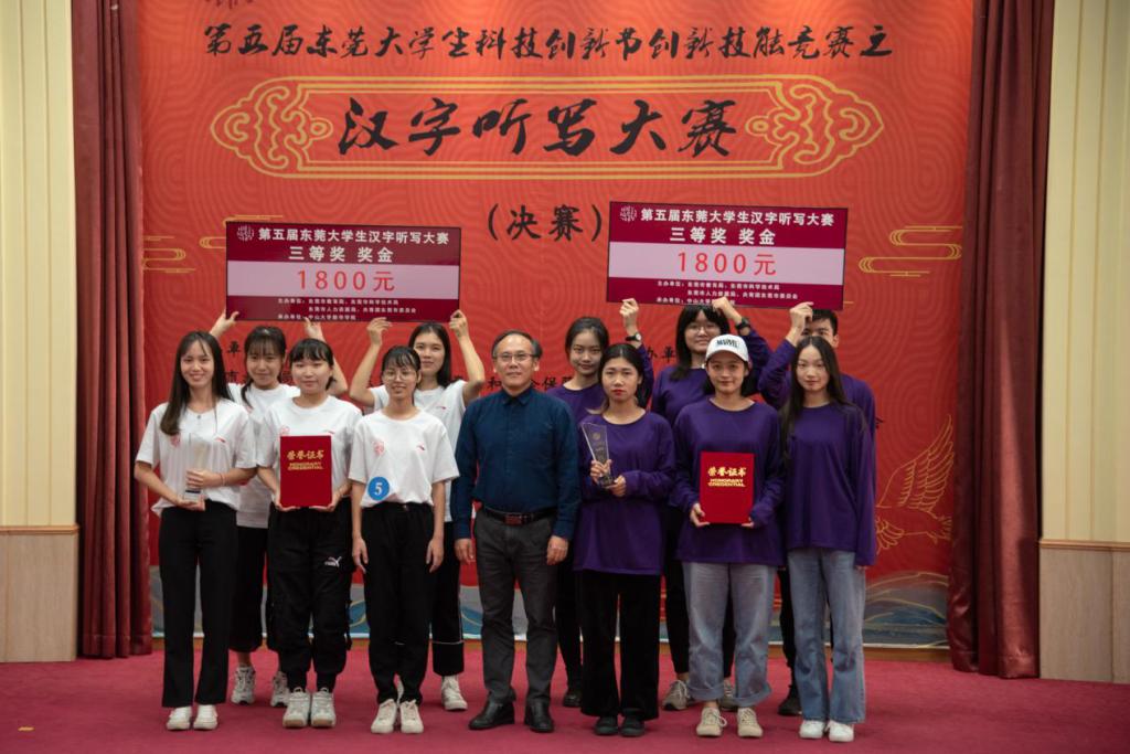 通过紧张激烈地角逐,来自东莞理工学院的“莞工汉韵队”与来自东莞理工学院城市学院的“风华队”凭借扎实的汉字基本功和灵活应变的现场反应能力脱颖而出,获得比赛的一等奖;来自中山大学新华学院的“风驰电掣队”和“新华响叮当队”,来自东莞理工农学院城市学院的“诗旅心阁队”获二等奖;来自东莞开放大学的“追梦队”,来自广东医科大学的“医路似锦队”,来自广东科技学院的“傲视群雄队”和“劈波斩浪队”获三等奖。