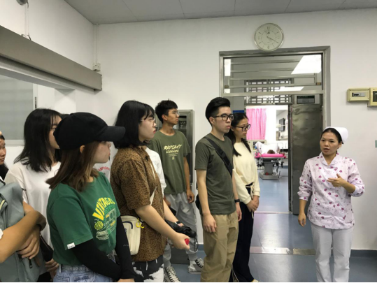 同学们在认真聆听广州校区护理学院实验室黄廷芬老师的讲解