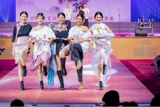 本届成果展首次增设“创意T”环节,即该部分的作品均来自设计师们天马行空的想象力,作品不限材质、不限风格、不限主题,进而充分激发学生的创意火花;此外,还特意面向全校师生招募志愿模特。模特均由设计师们面试确定,体态各异,涵盖“老中青幼”各年龄段,旨在打造一台属于“普通人”的创意秀,让服装设计和服饰艺术真正贴近每一个普通人的日常生活。学生模特们的肢体动作或是娇俏、或是优雅,突显了我校学子青春、活力的风采。观众们多次以热烈掌声,表示对学生设计者及学生模特们肯定与赞美。