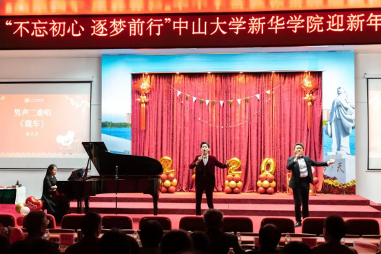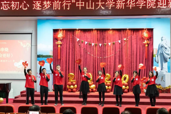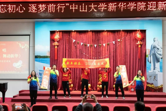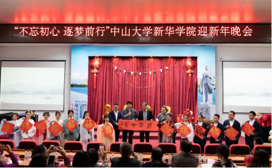 岁序更替,华章日新。在2020年即将到来之际,中山大学新华学院(以下简称“我校”)于2019年12月31日晚在东莞校区举行了主题为“不忘初心 逐梦前行”的迎新年晚会,我校领导、教职工、师生代表欢聚一堂,一同喜迎元旦佳节,告别硕果累累的2019年,共绘2020年的崭新蓝图。