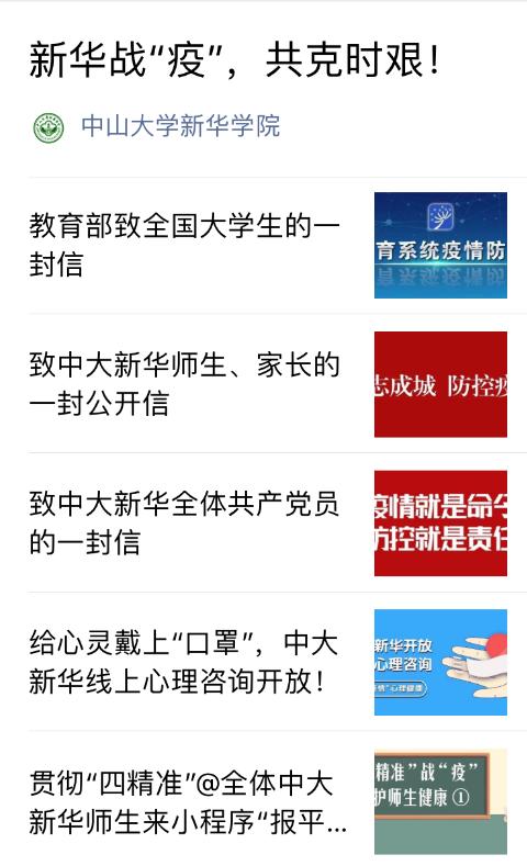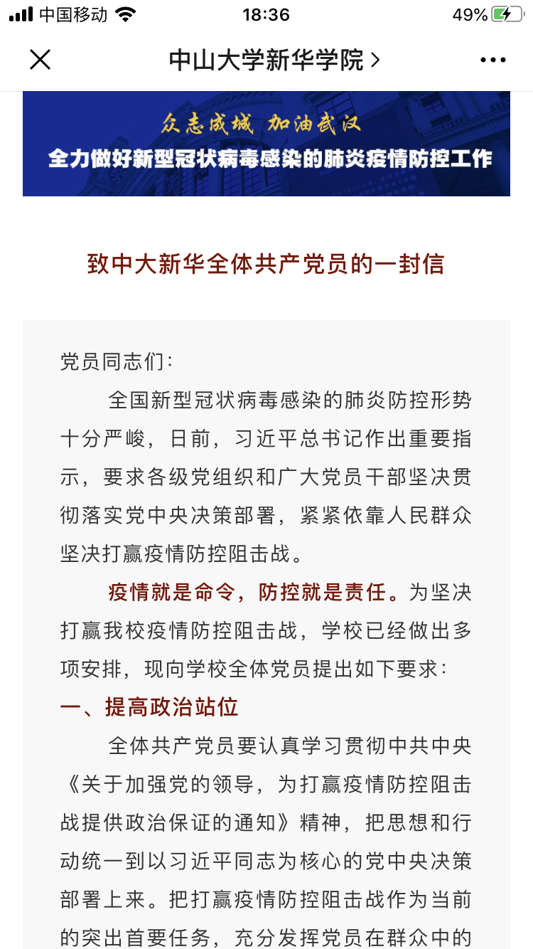 1月28日,学校官微、官网发布《致中大新华师生、家长的一封公开信》;1月31日,学校官微、官网发布《致全校共产党员的一封信》;2月1日,校团委官微《共青团中山大学新华学院委员会关于预防新型冠状病毒肺炎的倡议书》。号召全校师生、家长一起担起责任、坚定信心、众志成城、共克时艰;召开全校党员、团员亮身份、做表率,以身作则、带头示范,在战“疫”中发挥共产党员、团员的模范表率作用。各二级党组织、团组织公众号纷纷开辟“防疫在行动”专栏,发布通知、介绍防护知识,引导广大师生员工对疫情正确认知、科学预防。