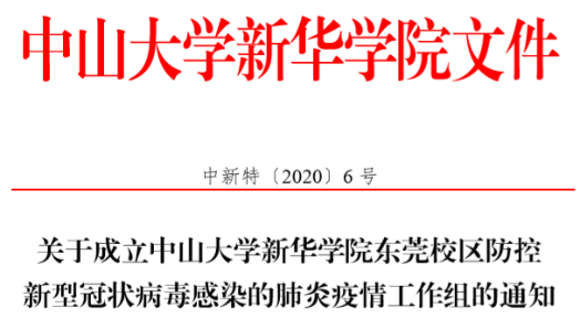 自疫情发生以来,学校立刻成立应急工作小组开展防控工作,于1月21日发出《关于贯彻落实<广东省教育厅关于做好学校新型冠状病毒感染的肺炎疫情防控工作的紧急通知>做好我校防控工作的通知》,协同全校各单位做好疫情防控工作;1月22日正式成立我校疫情工作领导小组,前后三次召开会议,并随即建立中大新华应急工作微信群、中大新华疫情防控工作领导小组、中大新华疫情防控工作办公室微信群,畅通线上沟通机制,随时线上开会交流工作,由王庭槐校长、周云书记团结带领工作组成员全天候深入一线、前线开展疫情防控工作,形成各单位疫情监控每日报告制度,密切沟通,全力防控。