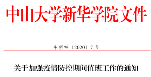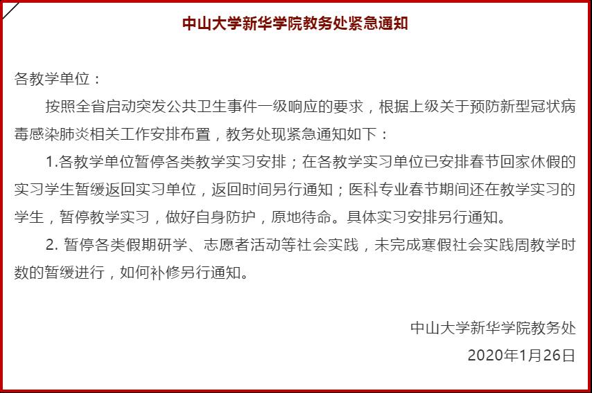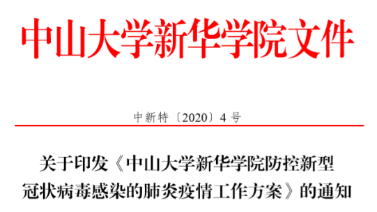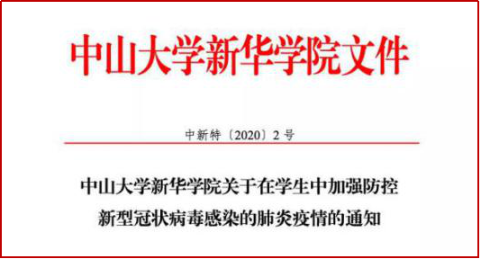 全校各单位团结协作,主要负责人坚守岗位,靠前指挥,党员干部以身作则,确保各项工作落实落细,学校公布《中山大学新华学院关于在学生中加强防控新型冠状病毒感染的肺炎疫情的通知》,要求全体学生: