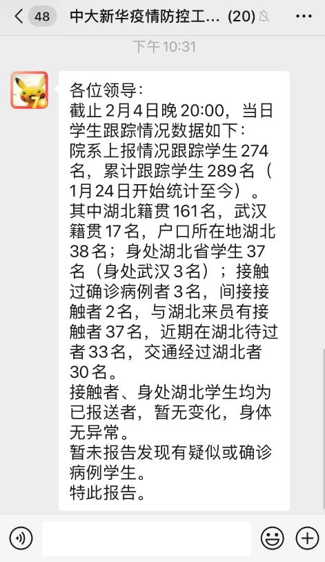 自疫情发生以来,学校高度重视疫情防控工作,学校党政领导班子团结带领党员干部认真学习习近平总书记重要指示,切实贯彻中央《关于加强党的领导,为打赢疫情防控阻击战提供坚强政治保证的通知》文件精神,充分发挥党员干部带头作用,迅速行动,组织具体落实中央、教育部、省、市、学校等各级工作要求,齐心协力,共筑防控疫情的牢固防线,实施各单位每日报平安制度,截至2月5日未发现感染病例。