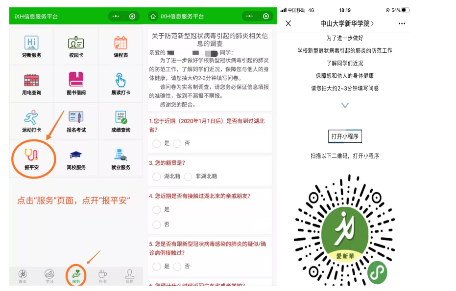 信息与网络管理处和学生处密切合作,在极短时间内开发了微信小程序“报平安”,全覆盖2.3万师生三天之内百分之百完成信息登记、报平安工作