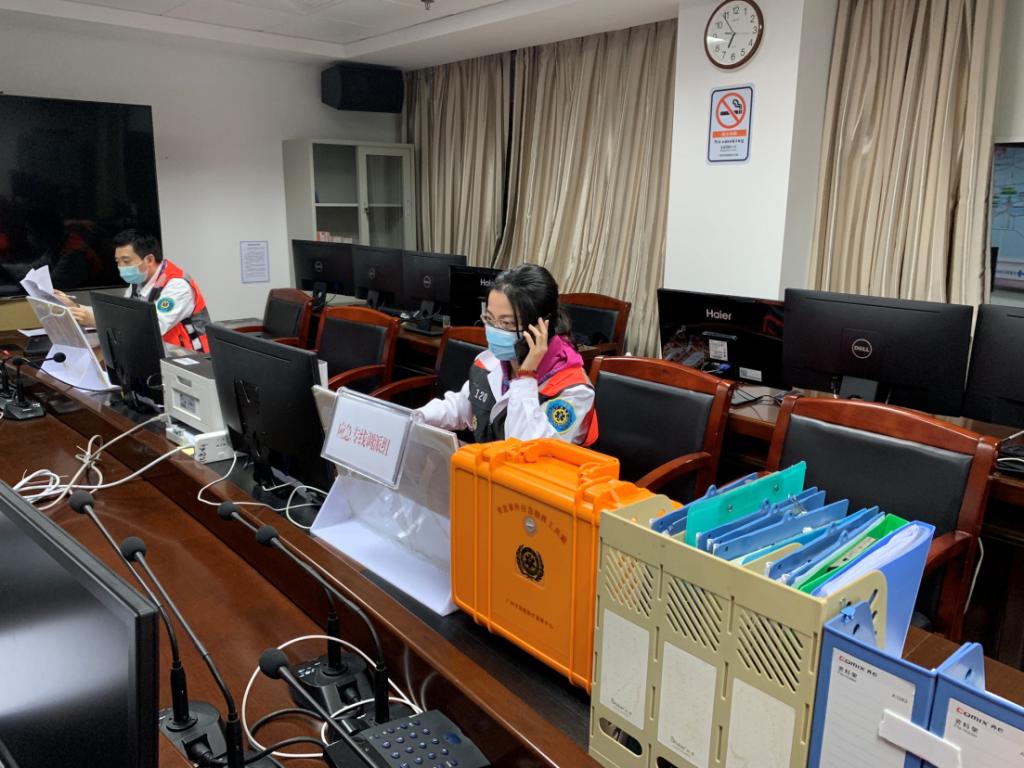 刘洋(右一)参与广州市急救医疗指挥中心应急专线调派组值守工作