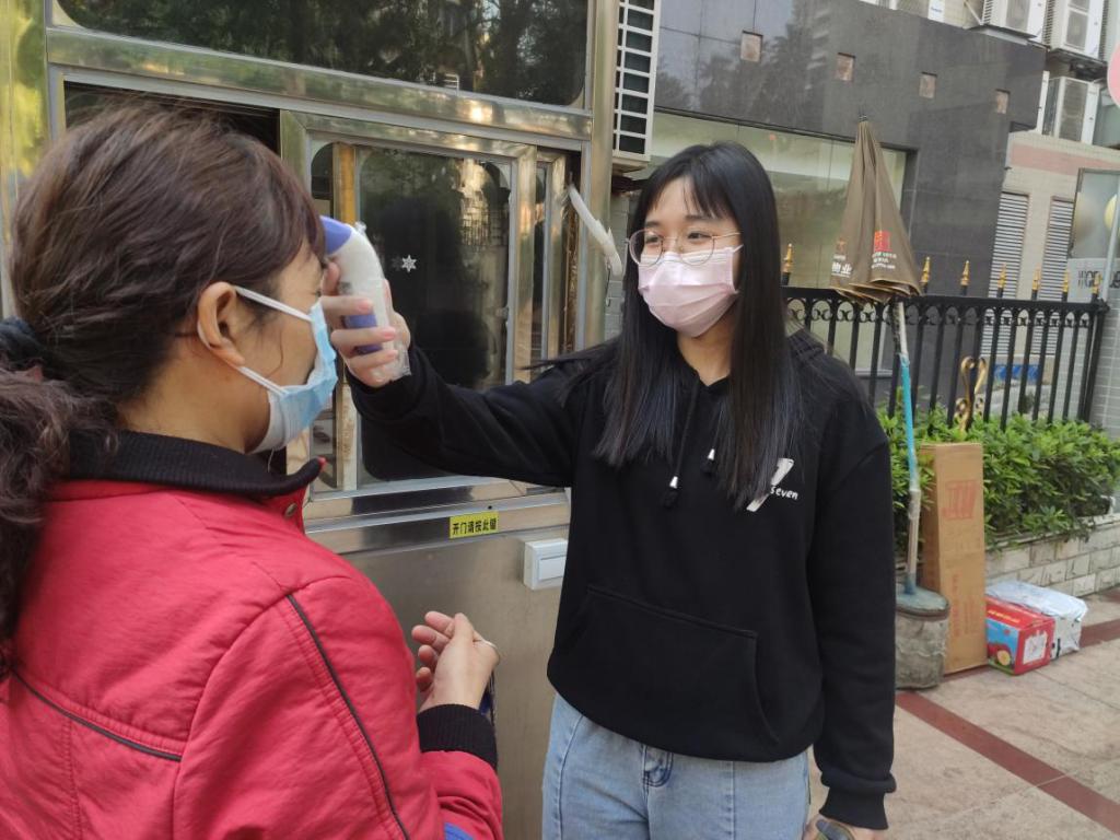 周丽敏同志(右)帮助社区居民测量体温