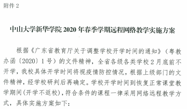 面对疫情防控的严峻形势,教务处分析研判、主动思考、积极谋划,做好了疫情防控期间教学组织预案,制定了《中山大学新华学院2020年春季学期教学工作实施预案》。