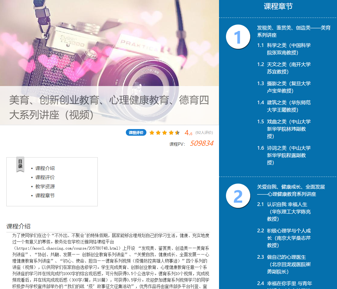 为了使学生居家能够合理规划自己的学习生活,健康、充实地度过一个有意义的寒假,教务处在学校泛雅网络课程平台上开设美育系列讲座、创新创业教育系列讲座、心理健康教育系列讲座和德育系列讲座(疫情防控英雄人物事迹),以供学生在家自由选修学习,为学生树立精神榜样,督促学生在做好疫情防控的同时不忘提升自我。