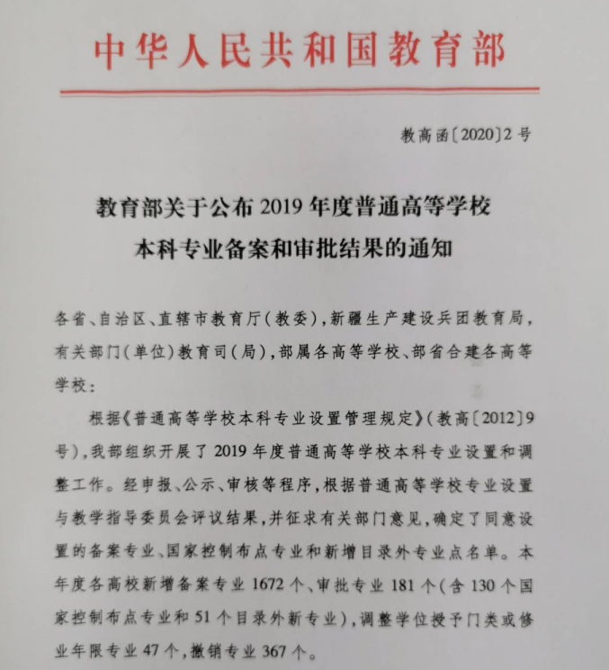 2月21日,教育部下发了《教育部关于公布2019年度普通高等学校本科专业备案和审批结果的通知》(教高函〔2020〕2号)。中山大学新华学院(下文简称“我校”)眼视光学、金融科技2个新专业获教育部审批通过。至此,我校本科专业达48个,涵盖经济学、法学、教育学、文学、理学、工学、医学、管理学、艺术学9个学科门类。