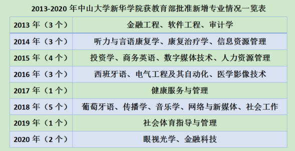 2013-2020年中山大学新华学院获教育部批准新增专业情况一览表