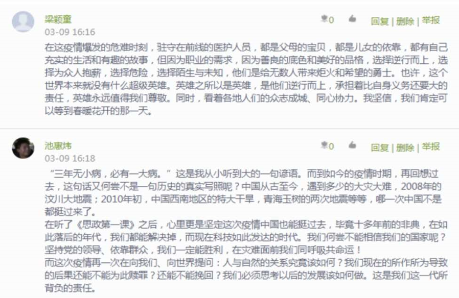 疫情防控工作中的感人案例是学习思政课的鲜活教材。通过对战“疫”中展现的中国精神、中国速度、中国奇迹的学习与思考,深化了同学们对马克思主义基本理论和马克思主义中国化最新成果的认识。观看课程后,同学们纷纷表示,通过“疫情防控思政大课”的学习为我们打赢这场战“疫”带来了巨大的鼓舞,作为大学生的我们要勇担历史重任,将青春梦想扎根祖国大地,以“咬定青山不放松,不破楼兰终不还”的韧劲,群策群力、众志成城,在这场“大考”中交出满意答卷。