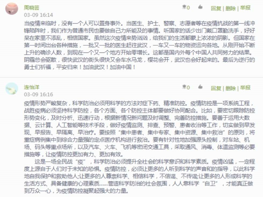17级金融工程专业的郭曾毅同学曾经响应国家号召,当兵入伍。观看了“大课”以后,他说:“面对来势汹涌的新冠病毒肺炎疫情,中国面对一些国家的质疑,顶着经济损失的巨大压力选择了封城。这正说明了党和国家始终把人民群众的生命安全放在了第一位,这是党全心全意为人民服务的最好体现。经过这次战‘疫’,我深刻地体会到,我们要将个人的力量、智慧和利益追求放在集体中来考量,共同为社会主义事业而奋斗。”