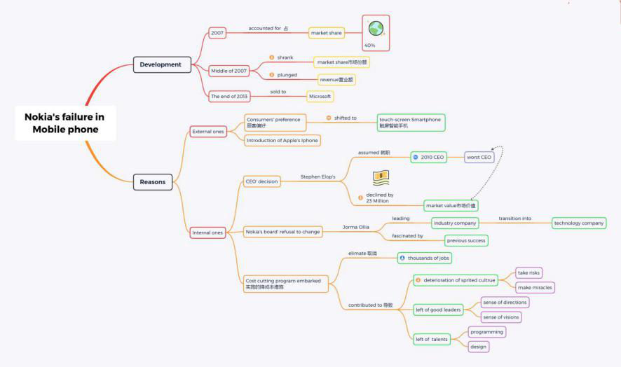 4.互教互学:学生以四人小组为单位,通过泛雅平台分享思维导图,并复述Nokia手机退出历史舞台的原因。同学们之间互相点评,任课教师也给出提高建议,从而达到互帮互学、互教互学,同时也提高了学生的沟通能力与思辨能力。