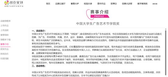 中国大学生广告艺术节学院奖是全国性的大学生广告专业奖项,号召全国各高校大学生为国内外知名企业进行命题式创意,这是全国最具影响力的大学生创意赛事之一。在全国各高等院校中深入人心,其影响已从高校延伸至广告行业,成为行业遴选人才、企业获取新鲜创意、品牌探索年轻化的重要途径。