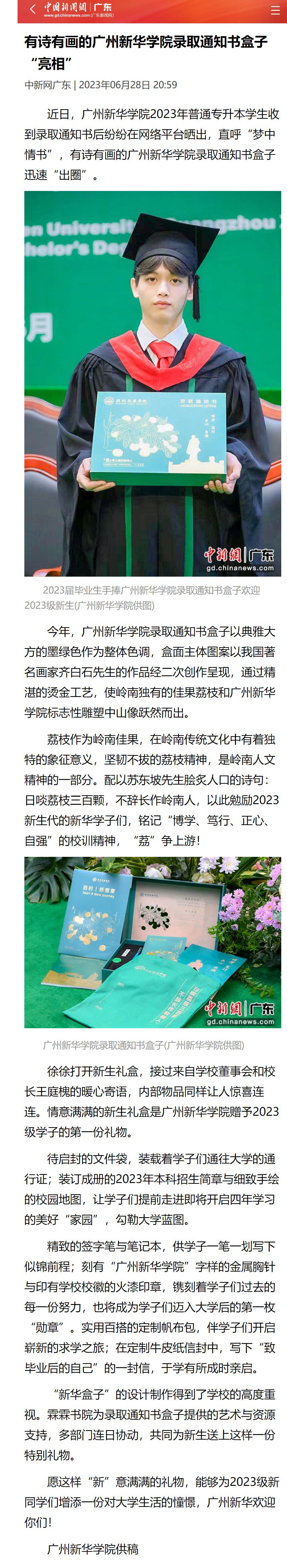 近日,广州新华学院2023年普通专升本学生收到录取通知书后纷纷在网络平台晒出,直呼“梦中情书”,有诗有画的广州新华学院录取通知书盒子迅速“出圈”。