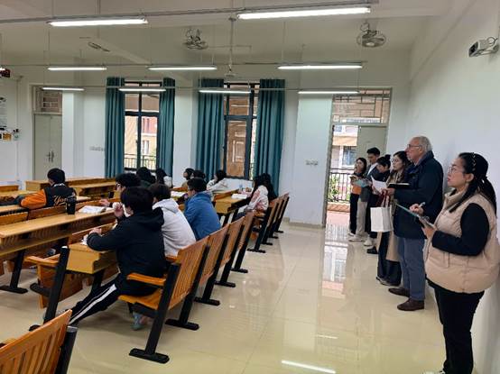巡课过程中,Ronald Anderson教授始终保持高度的专业专注力,不仅认真聆听教师讲解,细致观察学生反应,还就课程内容的前沿性、教学时长安排的合理性、课程定位的准确性、教学方法的创新性以及课堂活动的有效性等方面,与任课教师进行了深入交流。特别是在《商务英语》课堂上,Ronald Anderson教授与授课教师就“绿色金融”专题的教学设计展开了富有建设性的对话,他高度评价将国际热点融入语言教学的做法,并就进一步提升学生的跨文化沟通能力提出了宝贵建议。