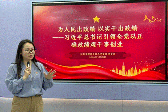 为积极响应党中央关于树立和践行正确政绩观学习教育的号召,进一步强化全体党员的宗旨意识,锤炼实干作风,3月18日,国际学院师生联合党支部开展专题学习活动。此次活动由国际学院党支部书记李文蓓主讲,全体师生党员参加。