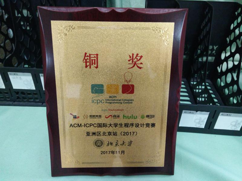 ACM国际大学生程序设计竞赛(英文全称:ACM International Collegiate Programming Contest(简称ACM-ICPC或ICPC))是全球大学生计算机程序能力竞赛活动中最有影响的一项赛事,是全球历史最悠久、规模最大且最负盛名的程序设计竞赛。第42届ACM国际大学生程序设计竞赛由各大洲区域预赛和全球总决赛两个阶段组成,区域预赛在2017年的10-12月举行,全球总决赛在2018年5月举行。我校信科院张锦邦、庄云晓、黄佳旭、朱志豪、曾惠靖、黄晓纯6名同学组成竞赛团队参赛。其中,张锦邦、庄云晓、黄佳旭在11月5日获得了青岛赛区银奖,张锦邦、朱志豪、曾惠婧在11月19日获得了北京赛区铜奖,张锦邦、庄云晓、黄晓纯在12月17日获得了EC-Final优胜奖。