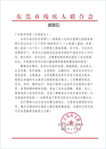 广州新华学院收到东莞市残疾人联合会的感谢信