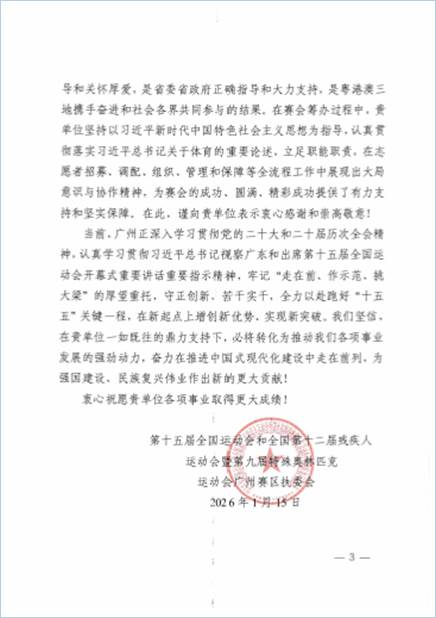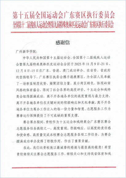 广州新华学院收到十五运会及残特奥会省执委会的感谢信