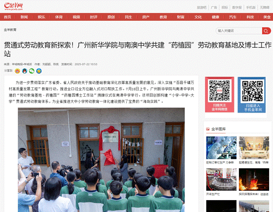 2025年7-9月,《中国新闻网》《南方日报》《羊城晚报》等媒体报道了学校与南澳县教育局联合主办的“杏坛笃行”学术沙龙,聚焦“数智赋能海岛教育”的创新模式探索,与南澳中学共建“药植园”劳动教育基地及博士工作站;霖霖书院于东莞校区举行书香新华·诗韵枫溪“006计划”公益活动公益捐书1000册,以实际行动为粤东基础教育注入文化动力,体现了学校的社会责任与担当,也为推动教育均衡发展贡献了“新华力量”。