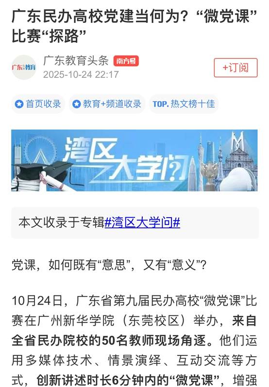 2025年10月,《南方日报》《中国教育在线》《中国高校之窗》《羊城晚报》《广州日报》《东莞日报》等媒体报道学校承办了广东省民办高校第九届微党课比赛,吸引了众多民办高校参与。这场以“砥砺作风勇担教育使命 立德树人奋进强国征程”为主题的赛事,不仅为民办高校搭建了党建交流平台,更展现了各校党建风采,促进了党建实践经验的分享与提升。学校以实际行动践行了党建引领下的思政教育创新。