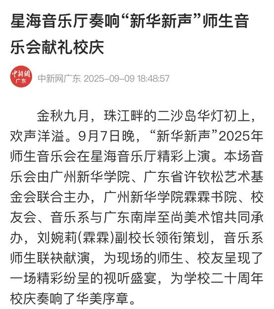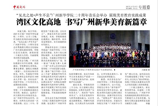 2025年9月,《中国新闻网》《广州日报》《羊城晚报》《新快报》等媒体报道了“新华新声”师生音乐会在星海音乐厅上演,师生们凭借精湛技艺,以美妙旋律回顾学校建校二十年辉煌历程,为现场师生、校友呈上一场视听盛宴,在庆祝学校二十周年校庆的同时,也展现了学校在艺术教育方面的丰硕成果。