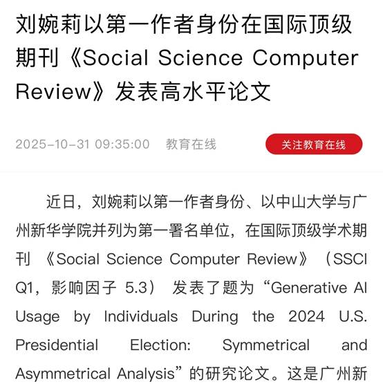 2025年10月,《中国高校之窗》《中国教育在线》《东莞日报》等媒体报道刘婉莉副校长于国际顶级学术期刊《Social Science Computer Review》(SSCI Q1,影响因子5.3)发表题为“Generative AI Usage by Individuals During the 2024 U.S. Presidential Election: Symmetrical and Asymmetrical Analysis”的研究论文,彰显了学校在人工智能与政治交叉研究领域的深厚学术积淀与创新能力。