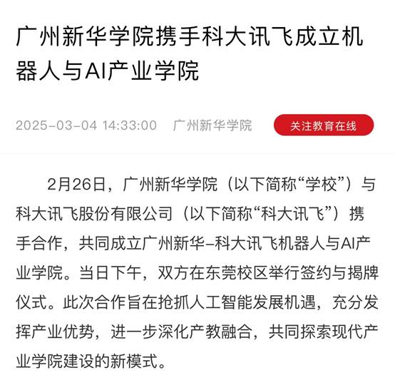 2025年3月,《中国高校之窗》《中国教育在线》等媒体报道了学校与科大讯飞股份有限公司携手成立广州新华-科大讯飞机器人与AI产业学院,共同探索现代产业学院建设的新模式,为培养适应时代需求的机器人与AI领域专业人才搭建了优质平台。