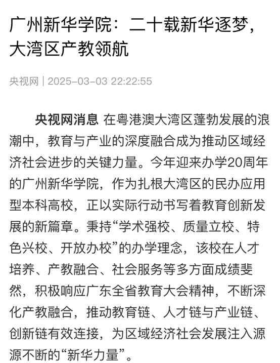 2025年3月,《央视网》《羊城晚报》等媒体报道学校作为扎根大湾区的民办应用型本科高校,积极响应广东全省教育大会精神,持续深化产教融合,推动教育、人才、产业与创新链条有效衔接,为大湾区经济社会发展注入源源不断的“新华力量”。