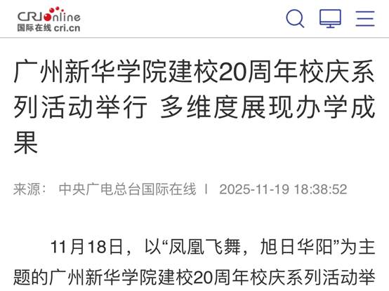2025年,广州新华学院凭借扎实且多元的办学成果,赢得了媒体的广泛关注与认可。从党建引领下的思政教育创新,到学生在各类竞赛中斩获的荣誉;从国际化办学的积极拓展,到招生录取的优质生源汇聚;从美育成果的精彩绽放,到产教融合的深度实践;从科研成果的不断涌现,到二十周年校庆的盛大举行;从毕业生就业的高位稳定,到数智化教学的稳步推进;从高质量发展的坚定追求,到社会服务的积极担当,每一个方面都彰显着广州新华学院的实力与担当。