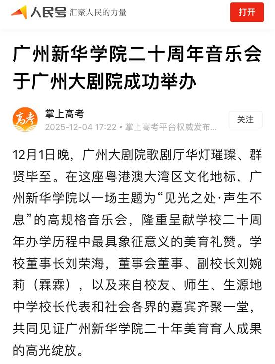 2025年12月,《人民日报》《中国新闻网》《中国新闻报》《中国日报》《中国网》《中央广电总台国际在线》《中国教育在线》《中国高校之窗》《南方日报》《羊城晚报》《东莞日报》等媒体报道学校二十周年音乐会盛况。学校在广州大剧院举办“见光之处 声生不息”高规格音乐会,献礼二十周年办学历程,展现美育成果。学校董事长刘荣海等领导,与校友、师生、生源地中学校长代表及社会各界嘉宾齐聚,共同见证这一高光时刻。这不仅是对学校过往的回顾与致敬,更彰显了学校在美育领域的深厚底蕴与积极作为。