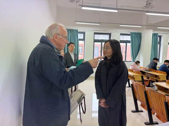 巡课过程中,Ronald Anderson教授始终保持高度的专业专注力,不仅认真聆听教师讲解,细致观察学生反应,还就课程内容的前沿性、教学时长安排的合理性、课程定位的准确性、教学方法的创新性以及课堂活动的有效性等方面,与任课教师进行了深入交流。特别是在《商务英语》课堂上,Ronald Anderson教授与授课教师就“绿色金融”专题的教学设计展开了富有建设性的对话,他高度评价将国际热点融入语言教学的做法,并就进一步提升学生的跨文化沟通能力提出了宝贵建议。