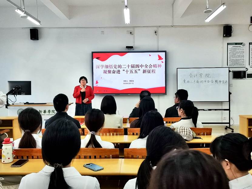 近日,会计学院党总支于东莞校区组织开展以“深入学习宣传贯彻党的二十届四中全会精神”为主题的宣讲活动。本次宣讲会由会计学院党总支书记李安兰教授担任主讲人。学院党总支副书记邓楚云老师、各学生党支部书记及委员出席,会计学院各支部学生代表参加。本次会议旨在深入学习、准确领会和贯彻落实党的二十届四中全会精神,引导学院师生统一思想、凝聚共识,明确新时代新征程的使命任务。