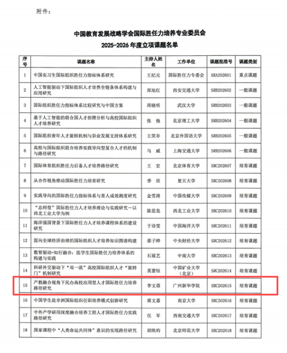 近日,中国教育发展战略学会国际胜任力培养专业委员会正式公示了2025-2026年度科研立项课题名单。广州新华学院国际学院院长李文蓓副教授主持申报的课题《产教融合视角下民办高校应用型人才国际胜任力培养路径研究》成功获得培育课题立项(课题批准号:SRC202615),学院教师团队共同参与攻关。