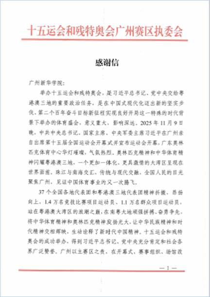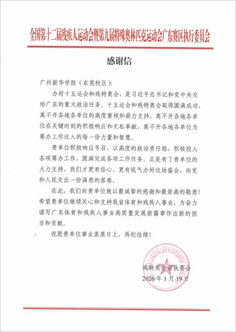 广州新华学院收到十五运会及残特奥会省执委会的感谢信