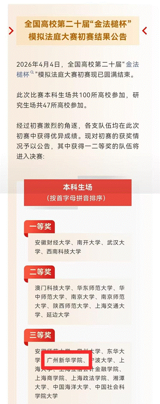 4月4日,第二十届“金法槌杯”模拟法庭大赛本科组赛事圆满落幕。广州新华学院法学院代表队从全国百所本科高校中脱颖而出,荣获本科组三等奖,成为本次大赛本科组前三甲中唯一获奖的民办高校。这一成绩充分展现了学校在法学实践教学与复合型法治人才培养领域的扎实成效。