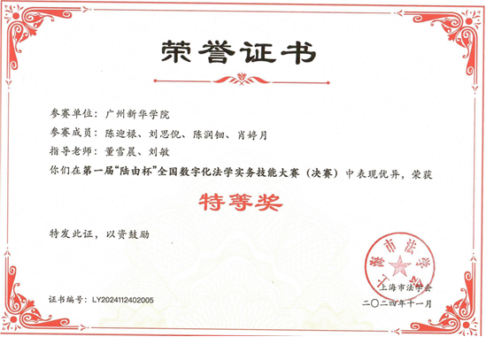 第一届“陆由杯”全国数字化法学创新大赛特等奖证书